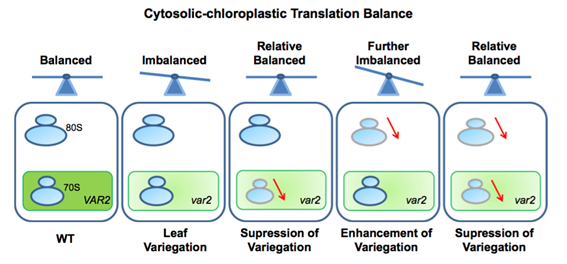 叶绿体是植物进行光合作用和合成多种重要代谢物的细胞器,其功能状态与光合作用效率以及作物产量密切相关。郁飞教授团队通过筛选拟南芥叶片花斑突变体var2的增强突变体,发现编码细胞质核糖体40S小亚基蛋白RPS21的基因发生突变,可以显著增强var2的花斑表型。对多个不同的编码细胞质核糖体60S大亚基和40S小亚基的突变体进行广泛的遗传互作分析,发现核糖体蛋白的突变体均可增强var2的叶绿体发育缺陷,但40S小亚基蛋白的突变体的增强效应强于60S大亚基蛋白的突变体,说明细胞质核糖体的大小亚基在叶绿体发育调控过程中的重要性并不相同,40S小亚基的作用更为重要。不仅如此,通过与抑制var2花斑的叶绿体翻译相关突变体的遗传互作分析,发现细胞质核糖体蛋白突变增强var2花斑的效应依赖于正常的叶绿体翻译过程。基于这些结果,提出了“细胞质与叶绿体翻译的平衡调控植物叶片花斑”的分子模型,根据该模型,在叶绿体发育过程中位于叶绿体类囊体膜上的FtsH复合物协同调控细胞质和叶绿体的翻译,保障叶绿体的正常发育。