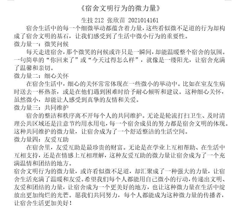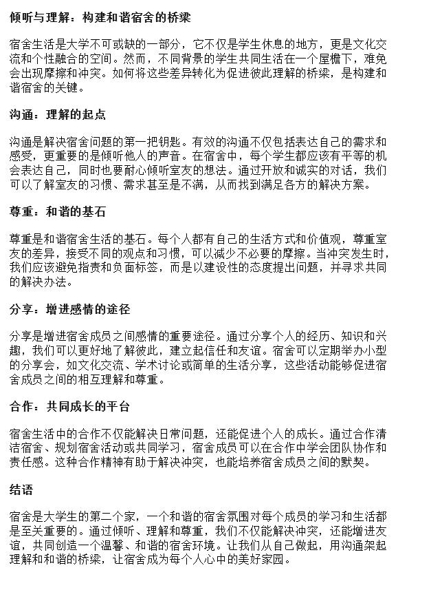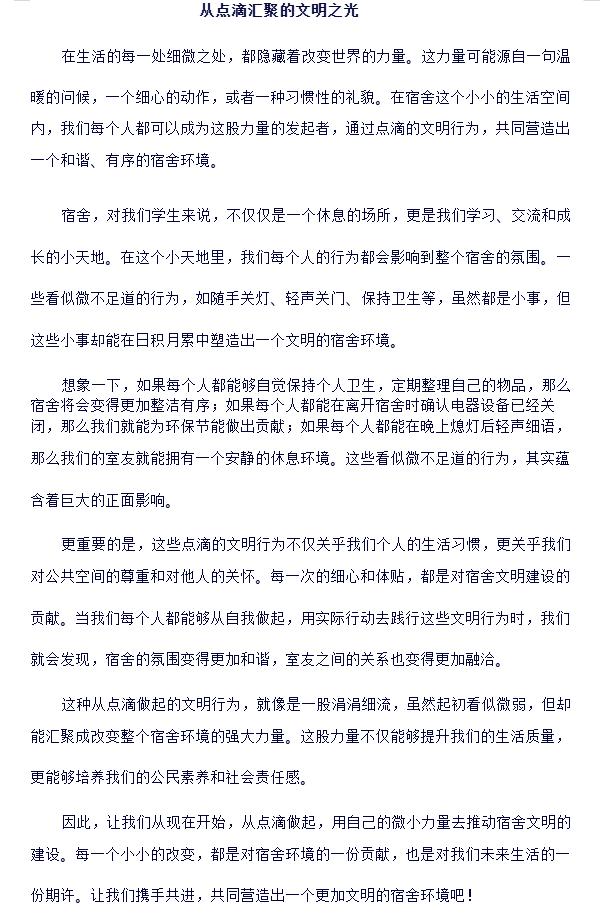 自征文启事发布之日起,广大学生积极响应,纷纷拿起笔墨,以文字记录宿舍生活中的点点滴滴,展现宿舍文明建设的成果与思考。参赛作品涵盖了对宿舍卫生、公共秩序、人际交往等方面的深刻见解,以及对未来宿舍文化的憧憬与规划。每一篇文章都是同学们心血的结晶,是他们对于文明宿舍理念的生动诠释。在活动期间,同学们纷纷就“共建温馨小家:我的文明宿舍故事”等八个主题展开思考,从不同角度出发,分享自己的观点和建议。他们深入剖析宿舍文明建设的重要性,提出了许多切实可行的建议和措施,受到了同学们的肯定和认可。