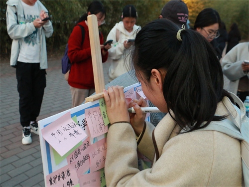 线下活动以“细水节流,节约为美”为主题,3月22日,在西北农林科技大学北校区小球馆和游泳馆之间开展了“节水知识问答”、“横幅签名”和“展板留言”等活动。“节水知识问答”活动通过随机答题的方式帮助同学们学习节约用水的常识,培养同学们节约用水、爱护水资源的意识。“横幅签名”活动让同学们在横幅上留下自己的名字,加深同学们节约用水的观念,能够更积极主动,自觉地从自身做起,参与节水活动,并将节水意识融入到日常生活中。“展板留言”活动中,同学们,参与到学校的节水工作中。