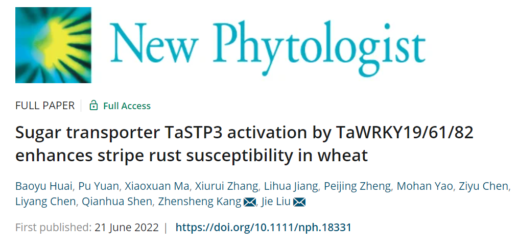 [科研进展]植物免疫研究团队康振生院士/刘杰教授课题组揭示糖转运蛋白TaSTP3介导小麦感条锈病的分子机制