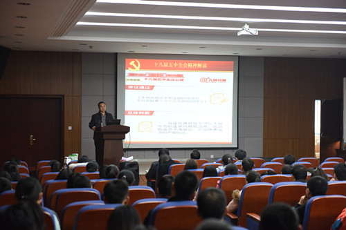 11月30日下午,yl8cc永利官网党委组织开展十八届五中全会精神学习活动,yl8cc永利官网十八届五中全会宣讲团成员、马克思主义学院高小升博士应邀做了以“树立新的发展理念,决胜全面建成小康社会”为主题的报告,学院全体党员聆听报告,共同参与学习讨论,会场座无虚席。