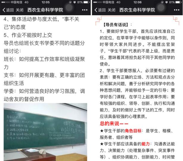 在专业分流过后,为了做好新旧班级的工作对接,学院号召班主任在新建班级中选拔出新一批班干部,而学生干部的培养,对良好班级的形成有密切的关系。因此,1月13日上午,学院动员14级各班新任班长、支书、学委以及组织、宣传委员共计50余名,由14级辅导员陈悦在理科大楼B111对其展开培训。同时,也在微信平台推送“如何当好学生干部”专题。