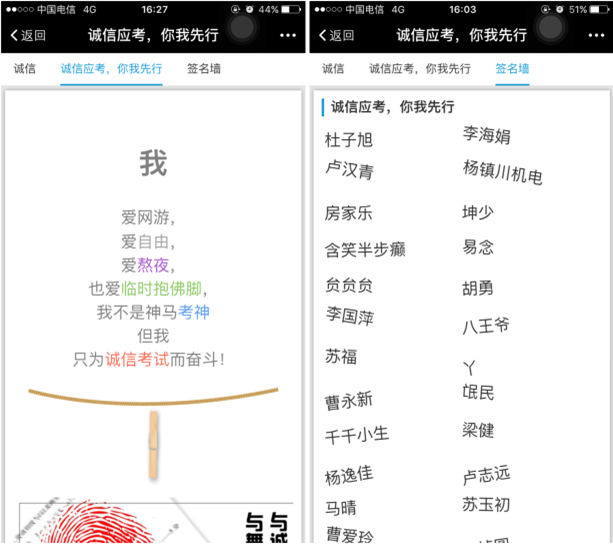 日前,学院结合陈坤明教授的知识讲座,将报名抢票提至线上;为引导学生诚信考试,还专门开设“诚信应考”签名墙;为实现复习资料资源共享,“易班”班长发布通知上传资料。使得同学们能够在线上充分交流。