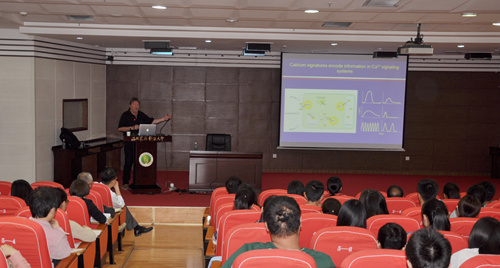 4月25日下午,Jörg Kudla教授在国际交流中心208会议室作了题为“Interaction of Calcium and ROS Signaling in Arabidopsis in response to salt stress”的学术报告,报告生动形象地介绍了其研究组运用一种新的双荧光蛋白来研究模式植物拟南芥根系中钙信号的传递,并得到了钙信号以波浪形式传递的相关结果。他还介绍了该小组在拟南芥中发现的一个CBL成员CBL8协同CIPK24调控盐害响应的相关工作。