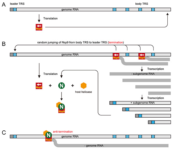 近日,陈红英教授课题组在实验研究中发现,病毒RNA聚合酶可以和其自身核衣壳蛋白N相互作用,课题组推测这种相互作用可能与病毒复制的调控相关。同时,在与英国Julian Hiscox教授课题组合作中还发现,核衣壳蛋白N可以和宿主编码的解旋酶相互作用,这一发现为N蛋白参与RNA合成调控的推测提供了有利证据。根据这些现象,该课题组构建了一个基于“终止-抗终止”机制的病毒复制调控模型,并通过后期的实验数据得以验证。
