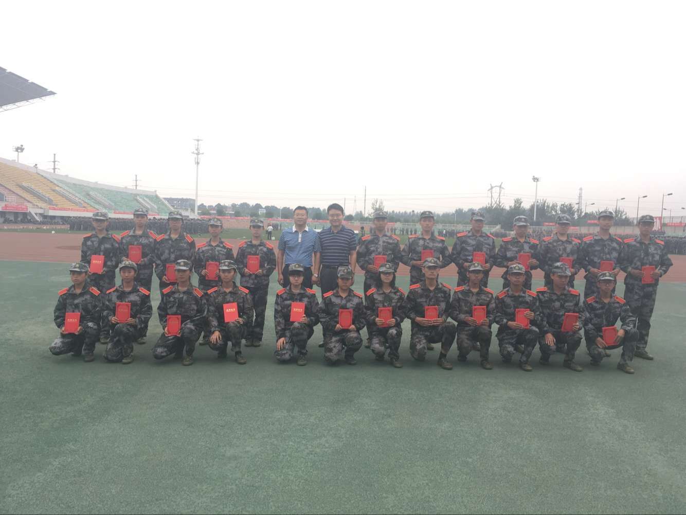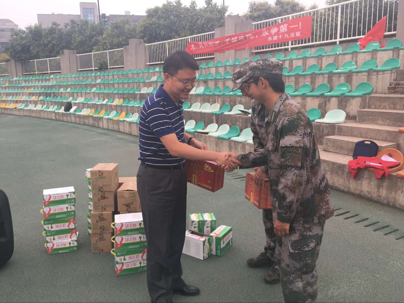 8月29日下午,学院院长郁飞、党委书记化小峰、副书记徐海等前往田径场看望并慰问正在军训的2016级新生,同时,为军训标兵颁奖。