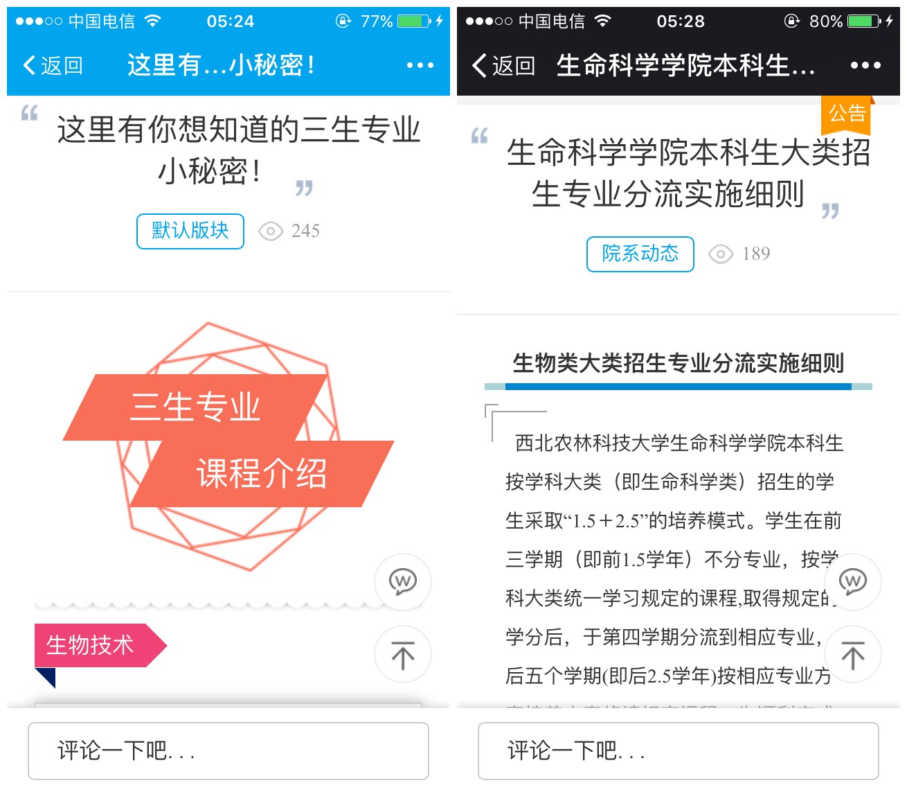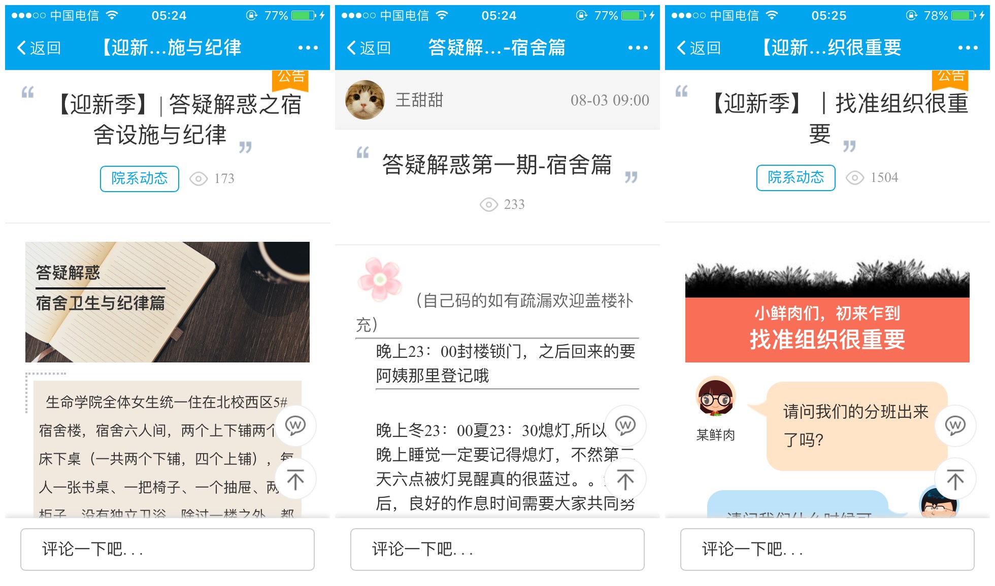对15级学生而言,第三个学期意味着专业分流的实施,为了能够使他们提前了解,做好充足的准备,学院易班利用暑假时间,推送了关于专业分流实施细则、三生专业课程设置以及三生专业介绍的相关内容,为开学的落实奠定一定基础。1506班的吴丕宇说:“我是易班班长,通过自己找‘三生’专业相关的资料,整理后给班里同学推送,不仅让我更加了解自己的专业,而且还能通过留言评论区跟大家分享自己的见解,很方便!”