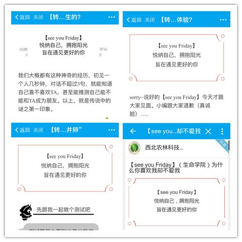 此外,学院还将心理健康教育专栏放在易班上,结合校易班工作站开发的“心理自助”模块,收集学生对心理健康知识的需求与分类,有针对性的设置相应活动,完全由学生自愿选择喜欢和感兴趣的模块报名参加。同时,结合活动反馈,在易班推出“see you friday”专题栏目,不定期推送有关心理健康小测试与知识。