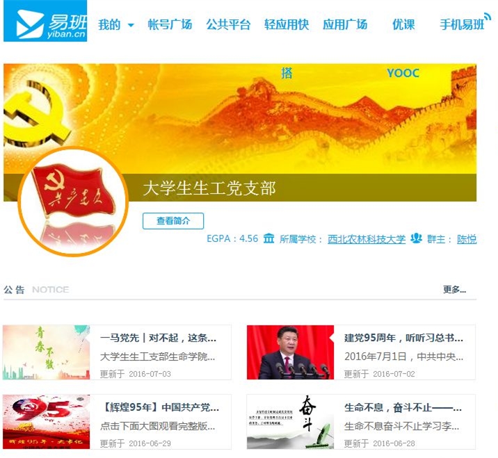 yl8cc永利官网“创易工作室”正式成立于2016年4月26日,旨在推进学院易班网建设,主要定位于服务在校学生,贴近学生实际。经过半年的不断探索与实践,初见成效,班级平均活跃指数EGPA值排名全校第一。截止目前,学院已有950余名在校本科生通过实名注册与认证。注册率达到78.25%,其中16级在9月17日已实现全注册;共建立31个易班班级,平均EGPA值达到70.87,其中生科142班EGPA值达到294.13,共有11个班的EGPA值超过100。(数据来源:yl8cc永利官网校易班工作总站20160919)。