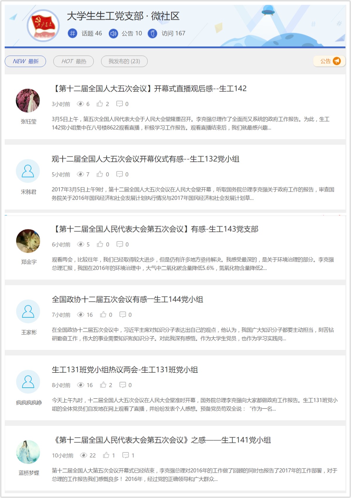 2017年3月5日上午9时,第十二届全国人大五次会议在人民大会堂开幕,大学生生工支部全体党员以党小组为单位,由8个党小组组长组织,观看直播,听取国务院总理李克强关于政府工作的报告。其中的议题引起了大家的关注,对总理的工作报告感慨良多,大家纷纷在易班线上党支部阵地交流讨论。热烈的讨论一方面使大家对工作报告的内容有了更加系统的认识,另一方面提高了对议案的了解。全体党员表示,将进一步深入学习两会内容,将其内化于心、外化于形,同时保持上进心态,努力学习,做合格党员!