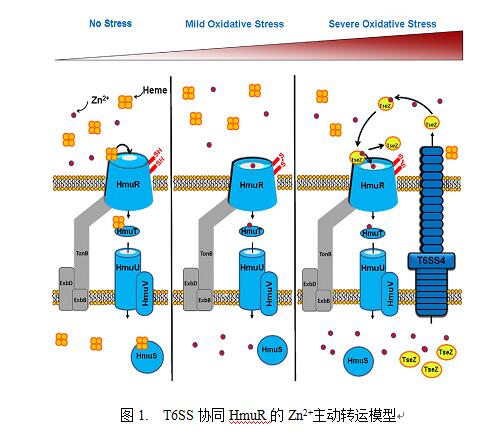 在病原细菌与宿主的斗争过程中,宿主可通过营养免疫机制限制入侵病原菌获取生长必需的铁、锌、锰等元素,而病原细菌则进化出一系列精细的手段对抗宿主的营养免疫。继近期揭示了细菌六型分泌系统T6SS在细菌获取铁和锰等元素以对抗宿主营养免疫研究之后(Lin et al., Nature Communications, 2017; Si et al., PNAS, 2017; Wang et al., PLoS Pathogens, 2015),沈锡辉教授实验室继续揭示了T6SS在细菌获取锌元素中的功能和作用机制。研究者发现泰国伯克霍尔德氏菌中的T6SS可通过分泌一个Zn2+结合蛋白TseZ转运锌并对抗氧胁迫, 通过GST pulldown从该菌细胞裂解液中筛选到一个与TseZ有特异相互作用的TonB依赖型外膜血红素转运蛋白HmuR。进一步发现,HmuR是一个与氧化还原调控相关的双功能转运蛋白,其在正常生理条件下行使血红素铁转运功能,而在氧胁迫环境下行使Zn2+转运功能,HmuR的底物切换通过响应胞外氧化应激信号导致分子内两个信号感受Cys残基形成分子内二硫键而实现。HmuR作为细菌抗氧化胁迫的第一道防线,不仅保证了细菌对胞外环境变化的快速响应,并且提供了一种精细调控机制使细菌对胞外不同程度的氧化应激信号做出对应等级的反应。基于以上结果研究者首次提出了T6SS协同HmuR的Zn2+主动转运模型(图1),并发现T6SS的Zn2+转运功能参与了非接触依赖性细菌-细菌竞争及对宿主的致病性,提示细菌六型分泌系统可以作为延缓细菌耐药性产生的新型抗菌药物筛选靶标。