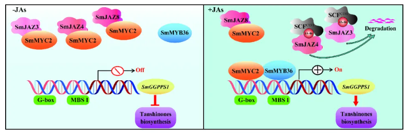 【科研进展】董娟娥/麻鹏达团队在SmMYC2-SmMYB36复合物参与MeJA介导的丹参酮生物合成分子机制研究方面取得新进展