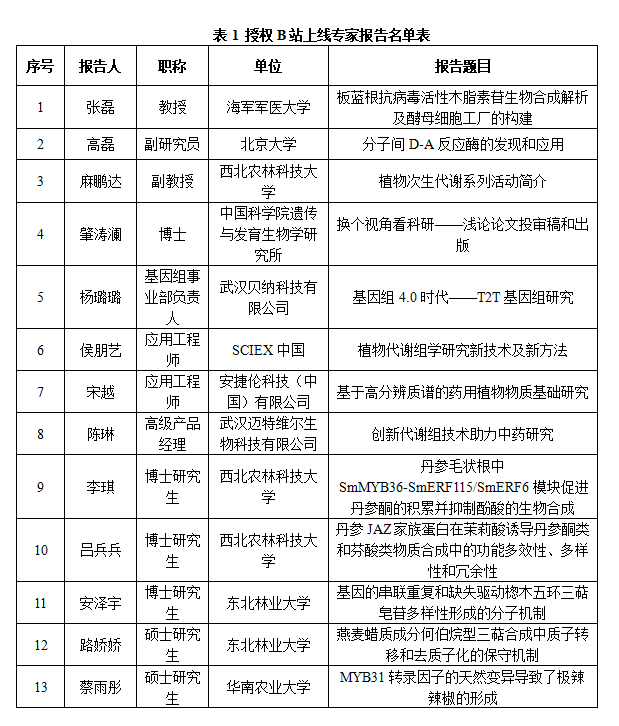 经过报告专家授权,部分报告将在B站“植物次生代谢论坛”主页免费上线开放(https://space.bilibili.com/1184715139),具体上线报告名单见表1。因报告视频要经过后期处理加工,因此预计每一到两周上线一个报告视频。具体上线情况请关注“植物次生代谢”公众号。