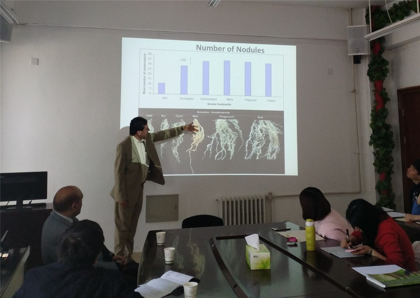 3月14日上午,Muhammad Ashraf教授和Shafiq Ur Rehman教授分别做了题为“How far is Enhancement in Crop Salt Tolerance Beneficial?”和“Plant Derived Smoke - The Magical Plant Growth Promoter: A Future Bio-Fertilizer”的学术报告。报告会上,Muhammad Ashraf教授针对目前国际上提高作物抗盐性的途径和方法作了系统性阐述,表示外源物质如甜菜碱、脯氨酸、海藻糖、甘露醇的应用,对提高植物抗盐性具有显著作用。同时,Shafiq Ur Rehman教授在报告中提出Smoke solution作为一种新的生物肥料,能够提高多种作物的种子萌发率并促进植物的生长发育,对环境健康及废物利用具有重要意义。报告结束后,与会师生和两位教授就报告内容、植物营养逆境生理和生物肥料等相关问题做了深入地交流和讨论。最后,还参观了学院大型仪器共享平台。
