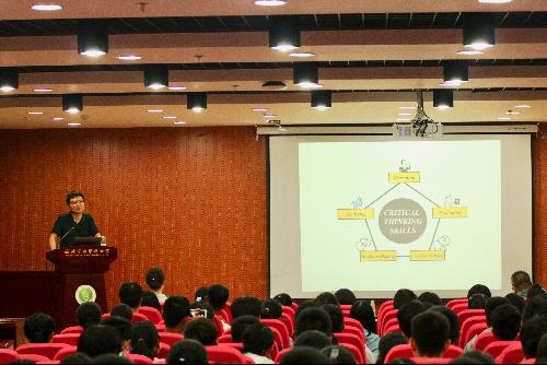新生第一堂课,郁飞以“大学生应当具备的几个意识”为主题,先后阐述了培养辨别意识、卓越意识、坚持意识和国际意识的重要性和必要性。整个讲座现场氛围活跃,郁飞生动地讲述着身边的故事,勉励新生勇于坚持科研,做筑梦、逐梦之人。