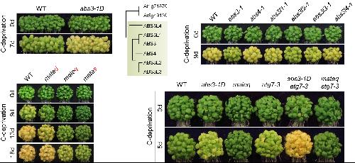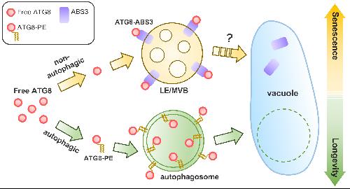 该研究利用碳缺乏诱导植物衰老研究体系,发现ABS3亚家族MATE转运蛋白促进植物叶片衰老和蛋白质降解,ABS3亚家族MATE基因的四重和六重缺失突变体对碳缺乏诱导的植物衰老表现出极强的抗性。MATE基因的四重突变体能够抑制自噬缺陷突变体在碳缺乏胁迫下的早衰表型,表明自噬缺陷时,衰老过程启动和进程依赖于ABS3亚家族MATE蛋白的功能。有趣的是,ABS3亚家族MATE蛋白在晚期内体上与自噬途径的关键蛋白ATG8相互作用,ATG8-ABS3互作是ABS3促进衰老和蛋白质降解的前提条件,但这一互作并不依赖于自噬途径或ATG8蛋白C端的切割和脂化,代表了ATG8的一个不依赖于自噬途径的新功能。对小麦ABS3和ATG8同源蛋白的研究发现ATG8-ABS3互作调控衰老的范式在双子叶和单子叶植物中保守。基于这些发现,该研究提出了ABS3介导的促进衰老的途径与抑制衰老的自噬途径共享ATG8,这两个途径的平衡协同调控植物衰老进程的模型。