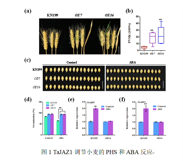 该研究首先在小麦种鉴定了一种与拟南芥JAZ3同源性最高的蛋白并命名为TaJAZ1。研究发现,过表达TaJAZ1 的转基因植株穗中的PVSK(visible sprouted kernels,可见的发芽谷粒)显著高于野生型小麦KN199,但转基因株系对ABA处理抑制种子萌发不敏感,同时,ABA处理明显诱导了野生型种子中TaABI5和TaABF1 的表达,但是这种反应在转基因株系中被消除,显示TaJAZ1是PHS以及小麦种子萌发的正调节因子并且TaJAZ1负调节ABA响应基因的表达。