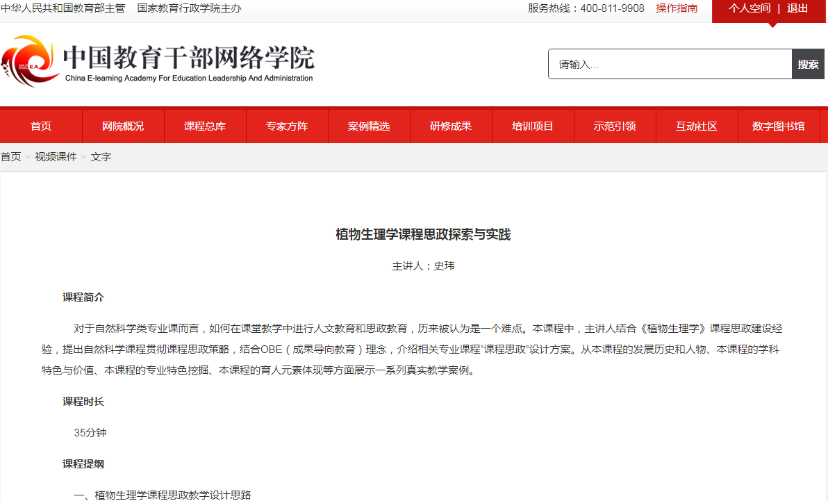 近日,由yl8cc永利官网史玮老师主讲的《植物生理学课程思政探索与实践》课程思政案例在国家教育行政学院高等教育管理干部网络培训平台上线。