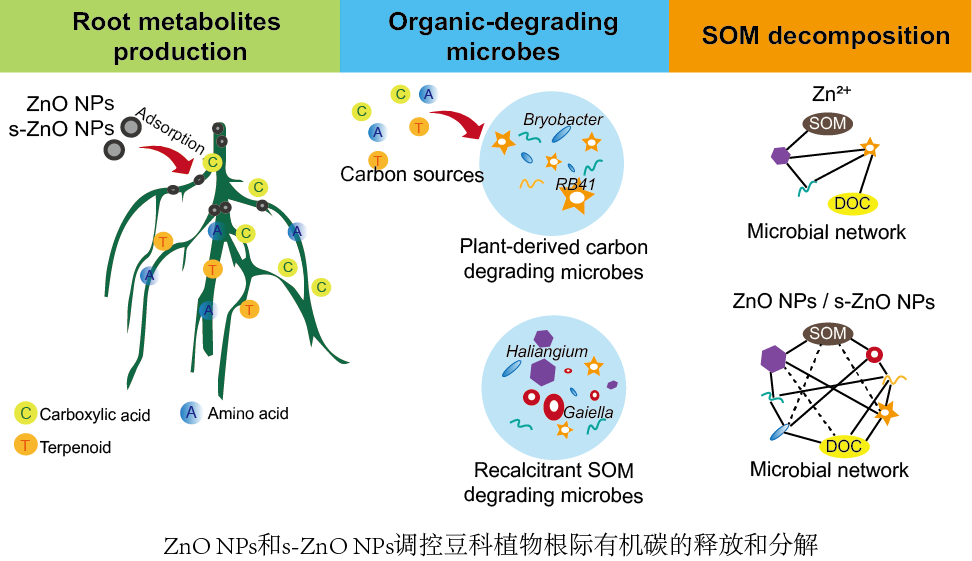 氧化锌纳米颗粒(ZnO NPs)是农业生产中应用最广泛的一种纳米材料。纳米颗粒在作物根际碳周转中发挥着重要的作用,目前ZnO NPs及其老化产物硫化锌(s-ZnO NPs)对豆科植物根际碳周转的影响及其机制尚不清楚,有待深入研究。