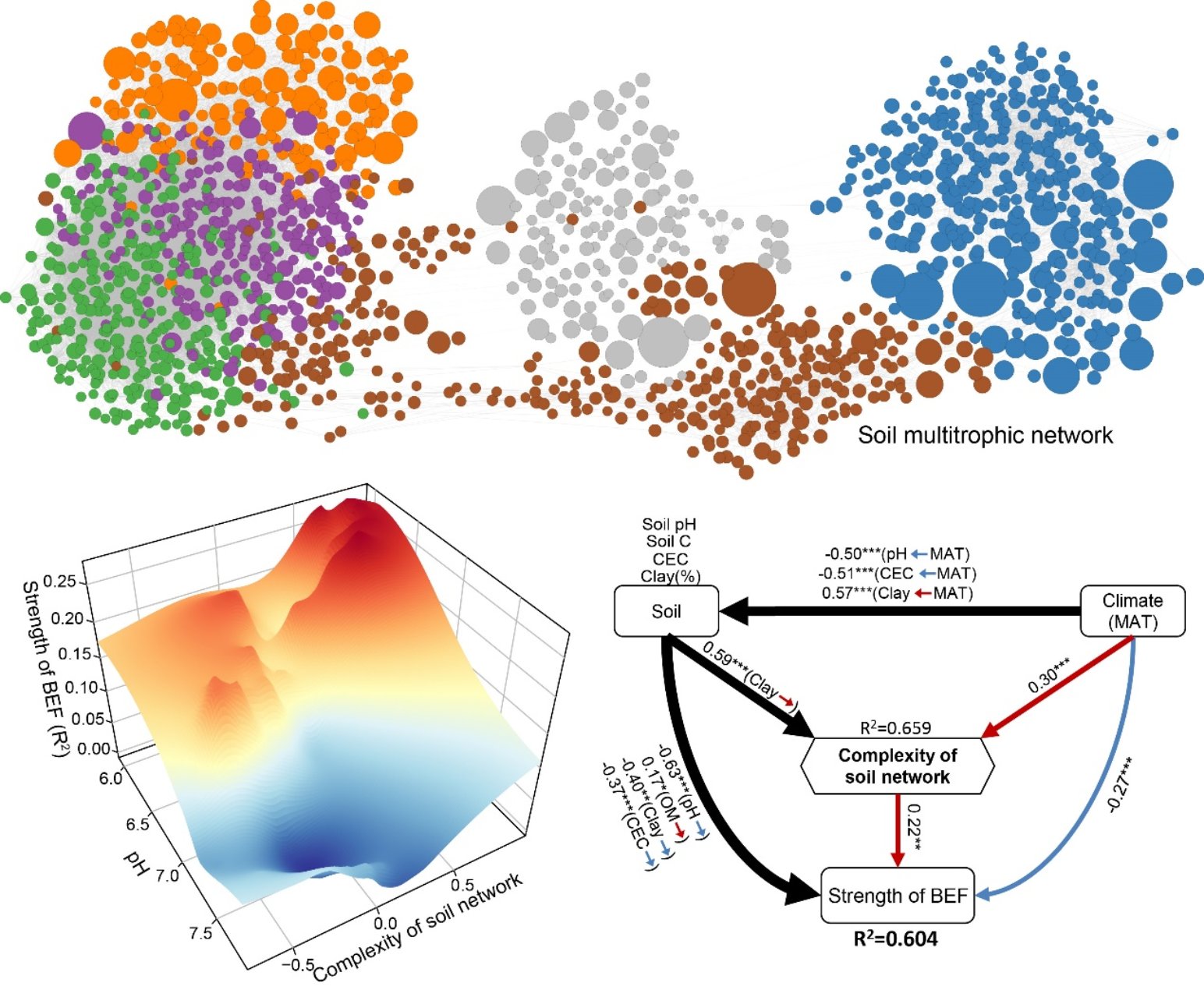 2021年10月,韦革宏教授研究团队在《Global Change Biology》在线发表研究型论文。揭示了土壤生物多样性在支持和维持农业系统生态系统功能中的重要性。农田土壤生物多样性与生态系统功能(biodiversity–ecosystem function, BEF)之间存在显著正相关关系,并且BEF关系的强度受土壤生物类型的影响。具体而言,与体积较小或在较低营养水平的土壤生物(如古生菌、细菌、真菌和光养原生生物)相比,体积较大或在较高营养水平的土壤生物(如无脊椎动物或原生动物捕食者)呈现出较弱或不存在BEF关系。且土壤多营养级间复杂的共生网络增强了土壤生物多样性和生态系统功能之间的联系。该研究在预测地下多营养生物对农田生态系统功能的影响方面取得了重要进展,并强调应将土壤多营养网络复杂性视为提高集约利用下生态系统生产力和可持续性的关键因素。