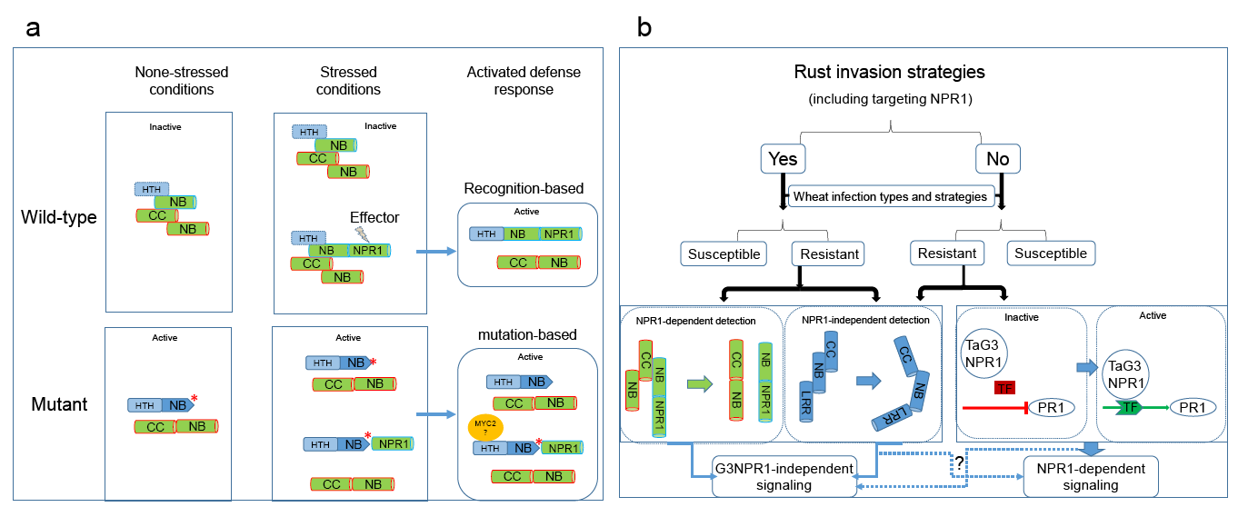 Ta7ANPR1基因转录的mRNA在小麦处于无生物胁迫状态下编码的蛋白只含有C-端的NB-ARC,并无NPR1功能域。一旦小麦处于生物胁迫状态下,Ta7ANPR1同时转录两个mRNA,一个编码NB-ARC,另一个编码NB-ARC-NPR1。在NB-ARC功能结构域上的某些突变能激活小麦对多种锈菌的防御反应(图3)和一个非SA通路上的PR基因的表达。由于NPR1在植物防御反应中的重要作用,NPR1蛋白也成为了一些病原菌的攻击目标。