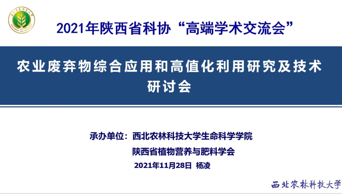 2021年11月28日,由陕西省科学技术协会主办,陕西省植物营养与肥料学会和yl8cc永利官网承办的“陕西省科协‘高端学术交流会’——农业废弃物综合应用和高值化利用研究及技术”学术研讨会(图1)在陕西杨凌以线上云端形式召开。研讨会由yl8cc永利官网副院长王存教授主持。