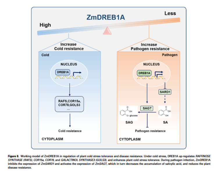 研究人员发现ZmDREB1A在玉米幼苗中受纹枯病病原菌立枯丝核菌(R.Solani)侵染诱导表达。进一步研究表明ZmDREB1A通过抑制或激活水杨酸代谢通路关键基因ZmSARD1和ZmSAGT的表达来调控水杨酸(SA)代谢。其中,ZmSARD1是SA合成的正调控因子,ZmSAGT负责将SA转变为非活性形式的水杨酸葡萄糖(SAG)。玉米DREB1A突变体在受到纹枯病病原菌R.Solani侵染时,与野生型对照相比,SA水平升高,SAG水平降低,抗病性显著提高。在拟南芥中过量表达ZmSAGT降低了SA水平,提高了SAG水平,降低了植物对病原菌Pst DC3000的抗性。该研究结果表明转录因子ZmDREB1A调控植物耐冷与抗病性之间的平衡。