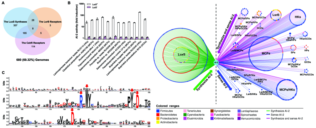 群体感应(quorum sensing,QS)是细菌种内和种间细胞间交流的普遍机制,通过合成和分泌称为自诱导物(autoinducer)的信号分子监测细菌群体密度的变化,协调细菌的群体行为。QS信号分子autoinducer-2 (AI-2)广泛存在于细菌中,既能介导种内交流,又能介导种间交流,被称为“细菌的世界语”,但人们对细菌如何感知该QS信号知之甚少。2020年10月该课题组发现原核生物(包括细菌和古菌)通过一类具dCACHE结构域的跨膜信号转导蛋白感知AI-2信号实现异种细胞间对话的新机制(Zhang et al., Nature Communications, 2020)。