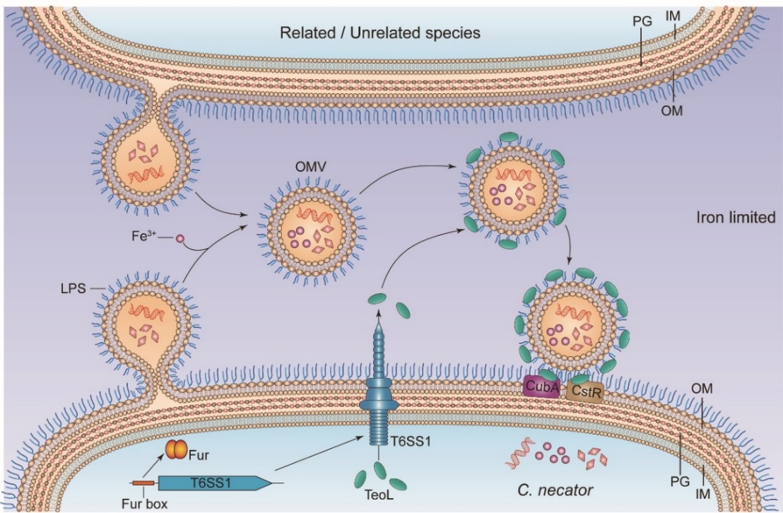 细菌外膜囊泡OMV是革兰氏阴性细菌在生长过程中形成的一种囊泡状结构。作为一种生物纳米材料,外膜囊泡不但在介导微生物群落间的相互作用中扮演着重要的角色,同时在疫苗研发、肿瘤免疫治疗和靶向纳米药物递送载体方面具有广阔的应用前景。然而,由于目前对于细菌如何识别和招募OMV仍所知有限,限制了当前对OMV生理生态功能的进一步深入认识。本研究中,研究者发现杀虫贪铜菌Cupriavidus necator中的六型分泌系统T6SS-1可分泌一个独特的LPS结合型效应蛋白TeoL,通过与OMV表面的LPS相互作用而结合到OMV表面;结合到OMV上的TeoL进一步通过与细菌外膜受体蛋白CubA和CstR的相互作用,介导OMV结合到细菌细胞表面,并最终实现对OMV中包括铁离子等货物的获取。通过招募OMV以获取其中的铁是一种新型细菌铁获取方式,深入研究这种铁获取方式不仅对于细菌铁转运领域有重要意义,并将为揭示细菌通过招募OMV获取其它营养物质和信号分子的机制带来启示。此外,这种通过识别OMV表面LPS进行招募的机制使相应细菌在微生物群落中能获取来自不同物种的OMV,从而赋予其在细菌种间竞争、抗氧化胁迫和基因水平转移等方面的生长和进化优势。